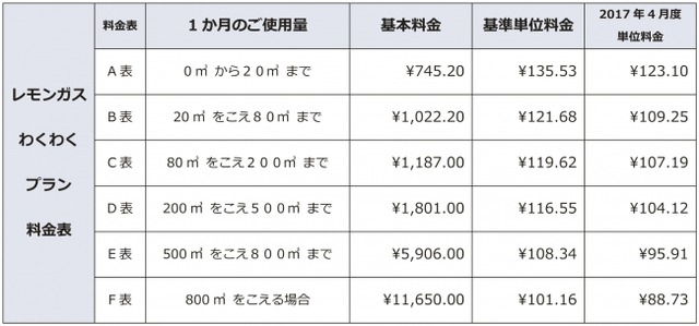 レモンガスの都市ガス料金は、お客さまのガスのご使用量に応じて、A表からF表の基本料金および従量料金(単位料金×ガスご使用量)が適用されます。