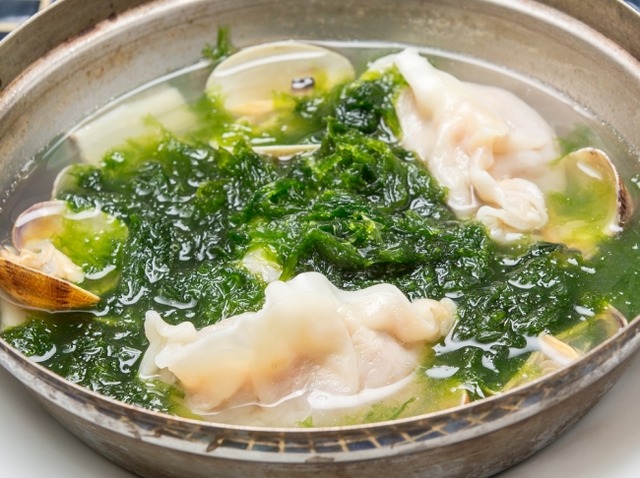アサリ出汁のスープに、春の旬の食材の代表格“タケノコ”を加えて餃子を炊き上げ、ビタミンCやビタミンE、葉酸、ナイアシン、パントテン酸やミネラルなど、栄養が特に豊富な“あおさ海苔”をたっぷりとトッピング。