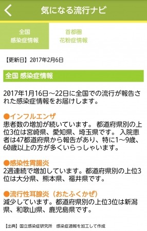 最新の健康コンテンツ『気になる流行ナビ』では、全国で流行している季節性の感染症や花粉症(首都圏対象)情報をお届けします。また、予防方法やお薬の服用、お勧めの市販薬(OTC医薬品)情報など薬剤師からのアドバイスもお届けします。