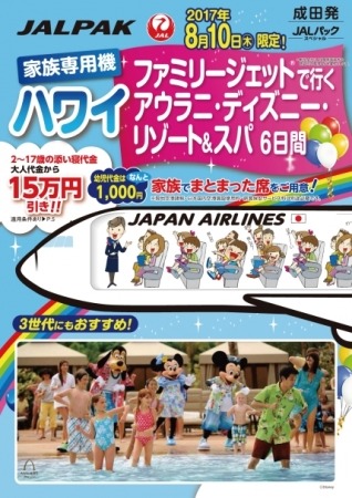 株式会社ジャルパック(本社:東京都品川区、代表取締役社長:藤田克己)は、8月10日(木)出発限定で、お子さま連れのご家族専用のJALチャーター機で行くハワイ6日間のツアー「ファミリージェット(R)で行く アウラニ・ディズニー・リゾート&スパ」を3月22日(火)より発売開始いたします。
