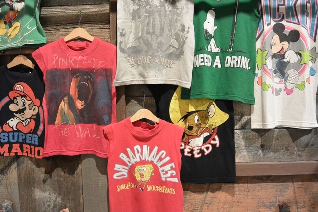 こちらのシリーズは全てUSEDリメイクとなるので、1点1点違うアソートデザインとなります。ベースにはヴィンテージのアメリカンキャラクター物からロックバンド物を使用し、フレンチスリーブのTシャツとワンピースにリメイクされた逸品です。