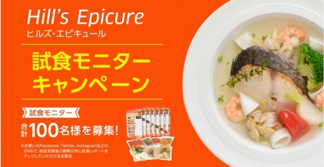 本商品のコンセプトにご共感いただいた上で専用サイトよりお申込みされたお客様の中から合計100名様に「Hill’s Epicure(ヒルズ・エピキュール)」モニターとなっていただき、商品をご試食いただきます。試食後には、FacebookやTwitter、Instagramなどで、試食した際のお写真や感想などを試食レポートとして指定のハッシュタグとともにアップしてください。