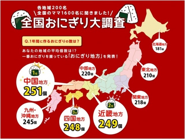 はじめに、ママたちが1年間に作るおにぎりの個数を聞きました。その結果、1人のママが家族のために作るおにぎりの個数は平均約228個。エリア別に見てみると、最も個数が多かったのは中国地方で251個、少なかったのは北海道地方の181個となりました。トップの中国地方以下、近畿地方、四国地方、九州・沖縄地方でベスト4を占め、西日本は総じて個数が多いようです。ここから、おにぎり作りは「西高東低」の傾向と言えるかもしれません。