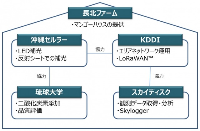 沖縄セルラー電話株式会社(代表取締役社長:湯淺英雄、以下 沖縄セルラー)、KDDI株式会社(代表取締役社長:田中孝司、以下 KDDI)、株式会社スカイディスク(代表取締役 CEO:橋本 司、以下 スカイディスク)、国立大学法人琉球大学(工学部:玉城史朗教授、以下 琉球大学)は、2017年4月より、マンゴー農場長北ファーム(宮古島)内で、IoTを活用したマンゴー栽培の実証実験を開始します。