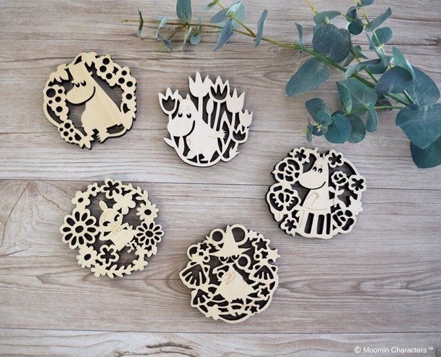 7mmの合板を細かくカットしてあげた木製コースターで、ムーミンやリトルミイなどのキャラクターを、自然のモチーフのお花や貝殻と組み合わせたナチュラルなデザインになっています。