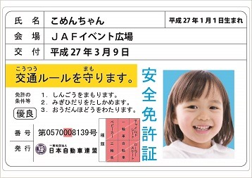 当日は、会場内にJAFブースを作り、交通安全のクイズに答えて免許証そっくりのカードがもらえる子ども安全免許証の発行・シートベルト効果体験・反射材効果体験も行い、交通安全に対する啓発活動を行います。