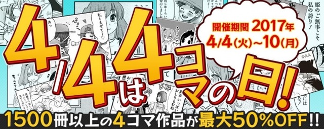株式会社ブックウォーカー(本社:東京都千代田区 代表取締役社長:安本洋一)では、2017年4月4日(火)より電子書籍総合ストアBOOK☆WALKERにて、1,500冊以上の4コマ漫画作品が最大50%OFFとなる「4/4は4コマの日!」を開催中です。