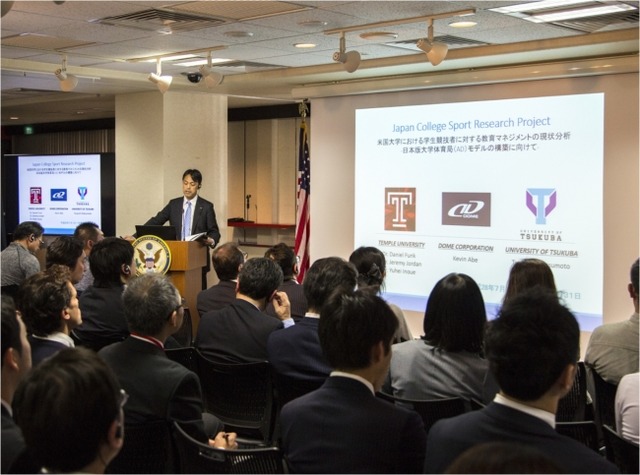 国立大学法人筑波大学(本部:茨城県つくば市天王台 学長:永田恭介)、米国テンプル大学(本部:米国ペンシルベニア州フィラデルフィア 総長:リチャード・イングラート)、米国アンダーアーマーの日本総代理店である株式会社ドーム(本社:東京都江東区 代表取締役CEO 安田秀一)は、3月29日(水)に合同で「米国大学における学生競技者に対する教育マネジメントの現状分析~日本版大学体育局(AD)モデルの構築に向けて~」の研究事業報告会を開催しました。