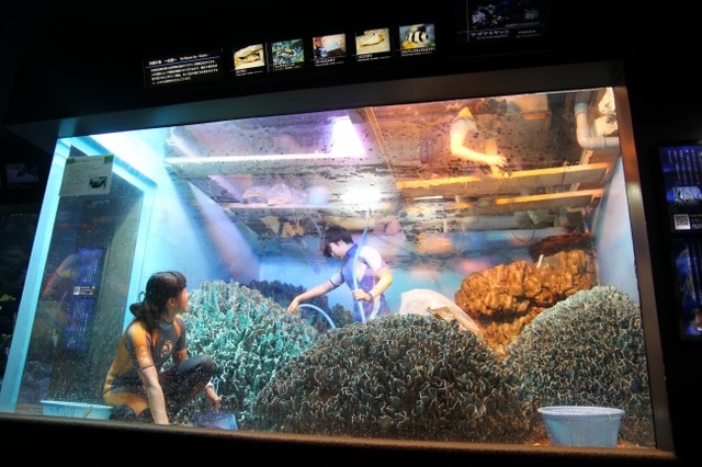水族館の水槽内は通常飼育スタッフが潜水してアクリルや擬サンゴなどをこすって掃除を行っていますが、一定の時間が経つと通常の清掃では汚れが落ちにくくなってくるため、水槽の水を排水して清掃する「落水塩素清掃」を定期的に行います。水槽の生物をすべて移動し、飼育スタッフが水槽の中で大掃除をします。
