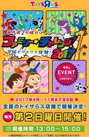 日本トイザらス株式会社は、2017年4月9日(日)より、「トイザらス・ベビーザらス 公式アプリ」( http://www.toysrus.co.jp/app )を使って、トイザらスの店頭イベントを巡るデジタルスタンプラリー『ファミリー★チャレンジ!2017』を開始いたします。今年4月から11月までの期間中、毎月第2日曜日に親子又は祖父母と孫の2人1組でご参加いただけるおもちゃ体験イベントを全国のトイザらス店舗※1(トイザらス・ベビーザらス併設型店舗含む)にて開催いたします。イベントに1回参加するたびに、公式アプリ上でスタンプが1個もらえ※2、5個スタンプが貯まると2,000円分の割引クーポン※3が進呈されます。