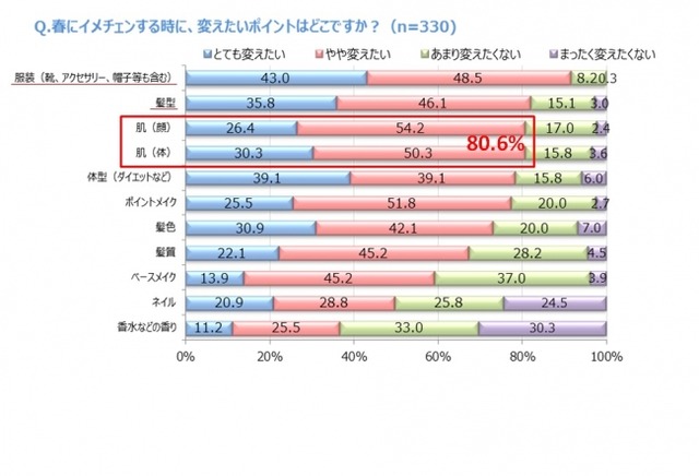 春にイメチェンしたいポイントについて聞いたところ、1位「服装」(91.5%)、2位「髪型」(81.9%)、3位は「肌(顔)」と「肌(体)」が同率で80.6%となり、「肌」へのイメチェン意識が高いことが明らかに。