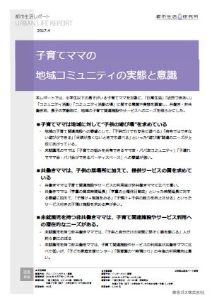 都市生活研究所では、2012年より地域コミュニティ研究に取り組んでいます。今回は子育て期において親の手がかかる年齢である「小学生以下の長子」を持つ子育てママを対象に、「日常生活」「近所づきあい」「コミュニティ活動」「コミュニティ活動の場」に関する意識や実態を調査しました。本レポートでは、夫婦共に就労時間週30時間以上の子育てママを「共働きママ」、週30時間未満の子育てママを「非共働きママ」と定義し、就労別、長子の学齢別に、地域の子育て関連施設やサービスへのニーズを明らかにした。