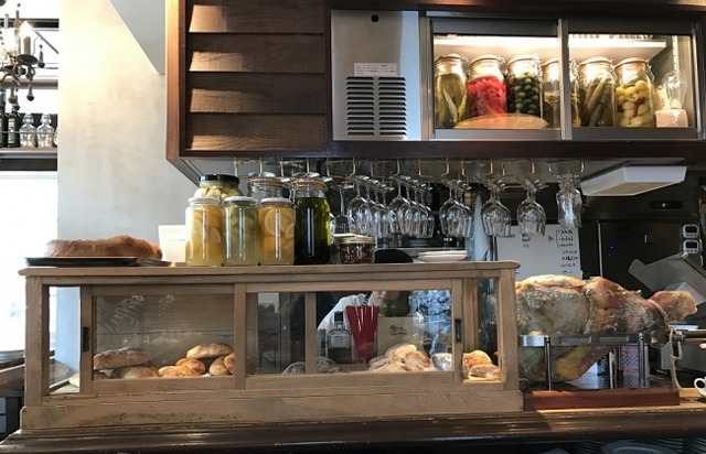 ディナーは、パンに合うバラエティー豊かなチーズやアンティパストを揃えました。チーズはその日おすすめの銘柄が常時5種ほどあり、店内の黒板にてお知らせします。カウンターには様々な野菜のピクルスやイワシのオイルサーディンが瓶詰めで並び、こちらも全てシェフの手作り。小玉葱やキュウリなどの野菜は、契約農家の農場までシェフ自ら足を運んで厳選した三浦野菜を使用しています。