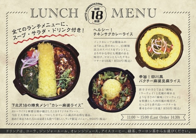 芸能人のファンも多い下北沢18がカレー激戦区に名乗りを上げる。お店で特に人気があるチキンサグカレーとパクチーが沢山入った麻婆豆腐が一体化したスペシャルプレートが登場。個性の強いカレーと麻婆だが、混ぜて食べると旨さが倍増。今までに味わったことのない融合に早くもリピーターが出るほどの人気に。ランチのみの特別メニューでサラダ、スープ、ドリンクが付いて950円とリーズナブルな価格を実現。