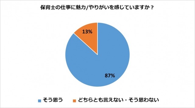 最初に「保育士の仕事に魅力/やりがいを感じられている」の要因関係についてご報告致します。この質問に対しては87%の人が「そう思う」と回答を致しました。(※5)