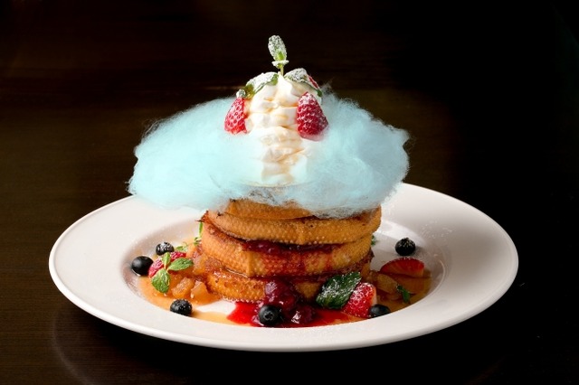 アップルジャムとベリーソースをサンドしたフレンチトーストに、生クリーム、ストロベリー、ブルーベリーをトッピング。