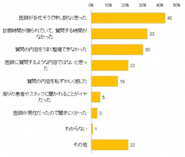 その理由を複数回答で聞いたところ、「医師が多忙そう」が43%、「質問する時間がなかった」が33%となり、忙しそうにしている医師の時間をとることに遠慮していたり、診察時間が短かったりすることが主な理由とわかりました。