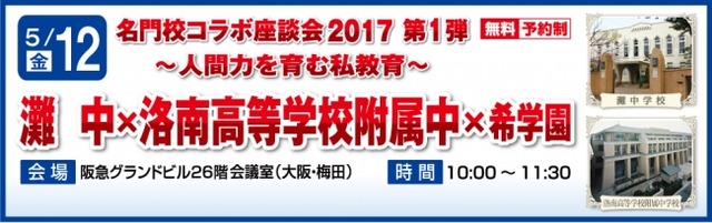 株式会社 希(のぞみ)学園(関西本社:大阪市北区 理事長 前田卓郎・学園長 黒田耕平/以下「希学園」)は、特別企画といたしまして、2014年より実施し、大変ご好評をいただいております「名門校コラボ座談会」、その2017年度第1弾といたしまして、《灘中×洛南高等学校附属中×希学園》を実施いたします。