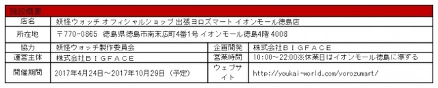 株式会社BIGFACE(本社:東京都中央区/代表:水野英明)は、株式会社レベルファイブ、妖怪ウォッチ製作委員会の協力のもと「妖怪ウォッチ」期間限定公式ショップ「妖怪ウォッチ オフィシャルショップ 出張ヨロズマート イオンモール徳島店」を、2017年4月24日(月) 9:00にプレオープン致します。同店は、常設店である「ヨロズマート」で人気の限定商品を気軽にご購入いただける出張店舗として期間限定で出店致します。