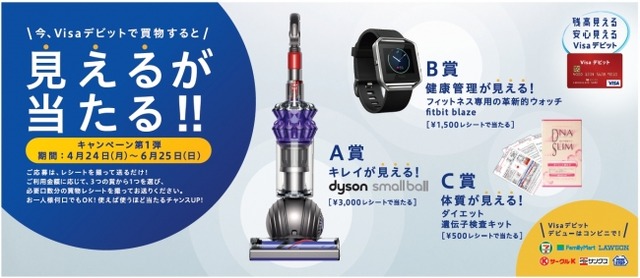 Visaデビットは、利用するとすぐに利用代金が銀行口座から引き落とされ、口座残高が確認でき、利用可能なお金が見えることから、「残高見える、安心見える」を新コンセプトとし今年1月より、テレビCMをはじめ施策展開をしています。今回の「見えるが当たる!」キャンペーンでは、Visaデビットでお買い物をすると、ご購入金額ごとに抽選で「見えると安心」をテーマにした豪華な賞品が当たります。応募期間は、4月24日から6月25日、専用の応募サイトから何口でもご応募可能です。