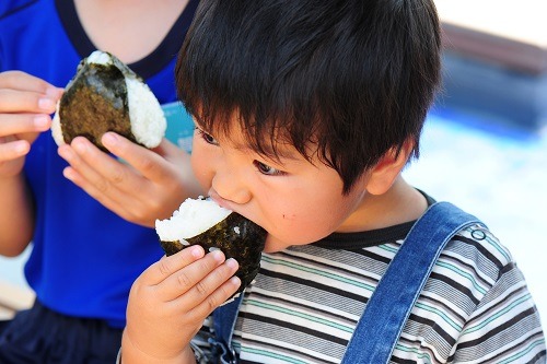 各回の「田んぼで遊ぼう!」プログラムの後には「京の里山」を眺めながら実際におにぎりを味わいます(※)。一連の里山体験を通して、見る、触る、聞くなど五感で自然や食物に関する経験をすることで、水といきもの、いきものと食物、食物と人とのつながりを感じ、「いただきます」の意味をより深く知ることができます。