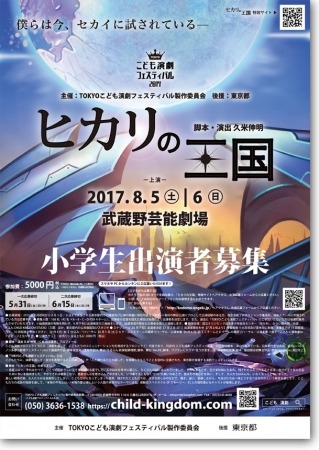この度、2017年8月5日(土)/6日(日)に武蔵野芸能劇場にて“TOKYOこども演劇フェスティバル2017 小学生だけの舞台『ヒカリの王国』”を上演致します。つきましては、本舞台公演に出演する小学生168名を全国から募集致します。応募は4月23日(日)から6月15日(木)まで、特設サイト(http://kodomo-engeki.jp/)内の出演応募フォームにて受付。2017年夏休み、最高の舞台をいっしょに創りましょう!