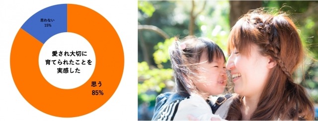 その結果、「母親と一緒に写っている写真」を見た時に85%の人が「愛されて育ったと実感する」と回答しました。また、カメラ目線の写真より「素の表情」が写し出された自然体の写真の方が、母親からの愛情をより実感できることが分かりました。