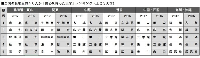 関東エリアでは「早稲田大学」、中部エリアでは「名城大学」が2年連続1位だった。