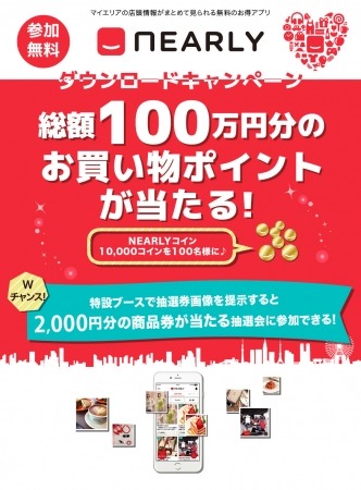 株式会社ipoca(本社:東京都港区、代表取締役社長:一之瀬卓、以下ipoca)が運営する、お買い物情報アプリNEARLY(以下、ニアリ)は、2017年4月24日(月)からスタートしているEST、天王寺ミオの2施設で「総額100万円分のお買い物ポイントが当たる!ニアリ大阪キャンペーン」を実施します。本企画は、ダウンロードキャンペーンとブース抽選会の2つの企画からなるものです。