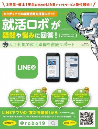 株式会社学情(本社:大阪市北区/東京都中央区、代表取締役社長:中井清和)は、就活ロボLINE@チャットサポートサービスをあさがくナビ2018に搭載し、サービスを提供しています。「24時間対応の人工知能によるアドバイザー」や、専属アドバイザー等による就活サポートも展開中。また、2019年卒学生向けサービスも受付をスタートしました。