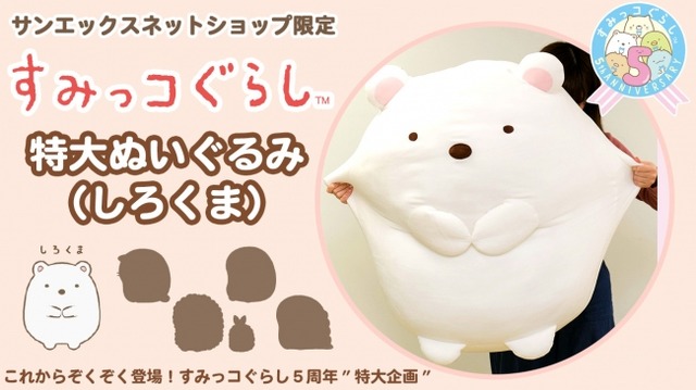 すみっコぐらし5周年を記念して、”すみっコぐらし特大ぬいぐるみ”がサンエックスネットショップ限定で待望の商品化!人気のすみっコたちが特大ぬいぐるみとなって次々と登場する企画『バトンをつなげ!!すみっコぐらし特大ぬいぐるみリレー』が始動しました。第1弾はまんまるとしたフォルムが人気の「しろくま」。期間限定の受注商品ですのでこれを逃したら手に入らないかも!?
