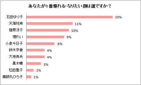 「あなたが1番憧れる・なりたい顔は誰ですか?」という質問に対して、20%の人が「石田ゆり子」さんと答えました。ドラマでも活躍している、白く透き通った肌が印象的な女優さんです。