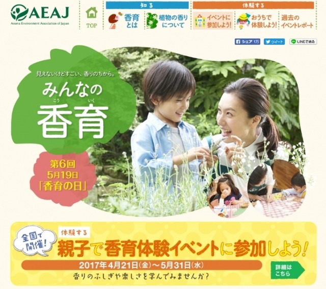 公益社団法人 日本アロマ環境協会(略称:AEAJ、東京都中央区)は、5月19日の「香育の日」を記念し、2017年4月21日(金)~5月31日(水)まで、親子で参加できる香育体験イベントを全国のAEAJ認定スクール(アロマテラピースクール)で行います。