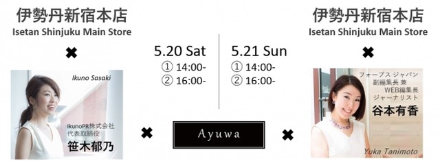 Ayuwaは働く女性応援ブランドとして、伊勢丹新宿本店での期間限定ショップ会期中である5月20日(土)には育休復帰後、転職を経て独立し、PR会社社長として活躍されPR支援やテレビ番組の企画提案も手掛けたikunoPR株式会社 代表取締役 笹木郁乃氏、 21日(日)には子育て中に経済キャスターからフィールドを広げ、フォーブス ジャパン副編集長 兼 WEB編集長、ジャーナリストとして活躍される谷本有香氏を招き、仕事、プライベート、ファッションとの関わりなど現代女性の関心が高いテーマについてお話を伺います。