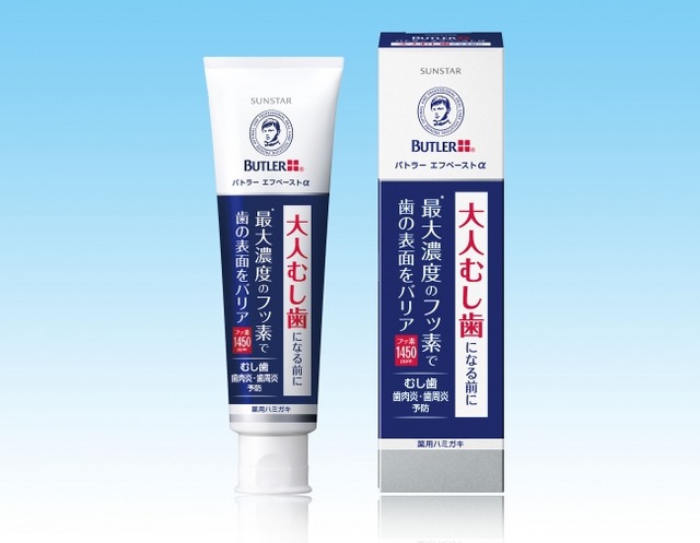 サンスターグループ オーラルケアカンパニー(以下サンスター)は、「BUTLER(バトラー)」ブランドより、大人向けむし歯予防ハミガキ「バトラー エフペーストα」<メディカルハーブタイプ>を、2017年5月15日(月)より、全国で新発売します。本品は、むし歯予防成分のフッ素をサンスターハミガキ史上最大濃度1450ppm配合。むし歯を予防し、さらに気になるハグキまでケア(歯肉炎・歯周炎予防)できる大人向けハミガキです。