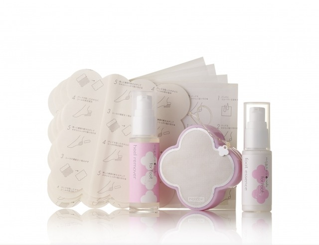 セット内容:ヒールリムーバー30ml、パッド・シール各4枚、フットスムーサー(限定色)、フットエッセンス30ml