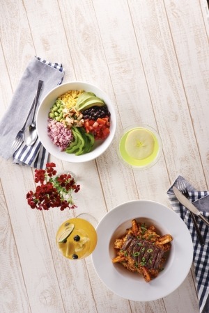 BBQソースを絡めたチャコールグリル豆腐、紫いものすし酢で味付けしたカリフォルニア米カルローズ、アボカド、トマト、グリーンパプリカ、コーン、ブラックビーンズ、枝豆をトッピングしたカラフルで、ヘルシーかつ栄養満点のサラダ。