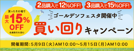 期間中、買い回り対象商品を2品購入で12%オフ!さらに、3品購入で15%オフになるお得な買い回りキャンペーンを開催中です!是非、このお得な期間をお見逃しなく♪
