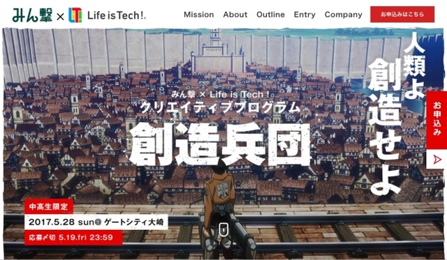 中高生向けのプログラミング教育事業を手がけるライフイズテック株式会社(本社:東京都港区、代表取締役CEO:水野 雄介)は、「進撃の巨人」の素材を使用し、中学生・高校生を対象に、ITやデザインを学ぶ1日無料イベント「創造兵団」をアドビ システムズ株式会社の協力のもと、2017年5月28日(日)にゲートシティ大崎にて開催します。