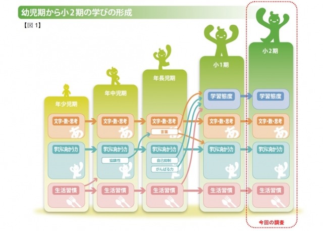今回、小学2年生まで追跡調査をしたことで、小1、2の「学習態度(自分から進んで勉強する態度)」には、幼児期の育ちが土台となっていることが改めて確認されました。新たに、この「学習態度」を伸ばすには、親が子どもの意欲を支えることや、学習環境を整えることが大切であることが見えてきました。