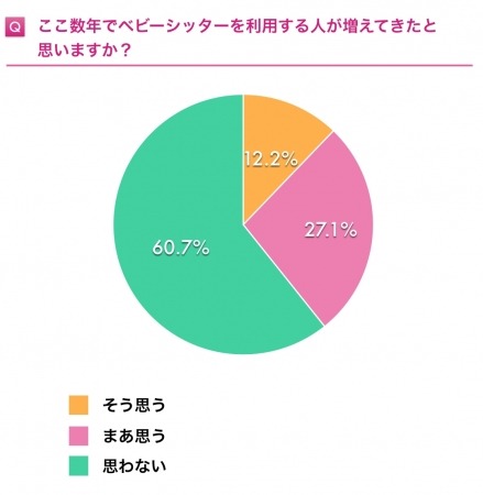 近年ベビーシッターを利用する人が「増えてきたと思う」「まあ増えてきたと思う」と感じる人は、合わせて39.3%。その理由として、「共働きの家庭が増えているから」「保育園に入れない待機児童が多いから」「テレビやメディアなどでよく見かけるようになった」という意見が中心でした。以前は一部報道などでネガティブなイメージだったベビーシッターが、近年は、必要に迫られ身近な存在へと変化し、日本でのベビーシッター認知の裾野が広がってきていることがわかりました。