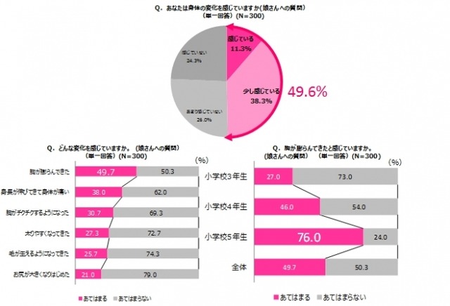 1.プレ思春期の娘の49.7%、小学5年生では76.0%が胸の変化を感じている