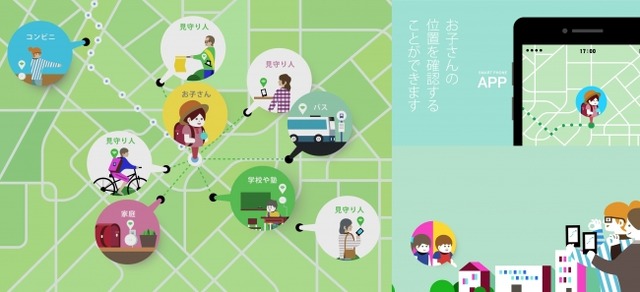 本サービスでは、ビーコン(電波受発信器)を搭載したキーホルダーなどの専用端末を持つ高齢者や子どもの位置情報履歴を、家族や保護者などがスマートフォンやパソコンで把握する ことができるほか、予め登録した場所を見守り対象者が通過した場合に、位置情報をメールで確認することも可能です。専用端末は、GPS端末と比較して低コストかつ電池寿命が長いため、頻繁に充電する必要がありません。また、ビーコンの電波を受信する基地局も電源コンセントにさすだけで設置できるため、本サービスの基盤となるシステムを速やかに構築できることが特徴です。