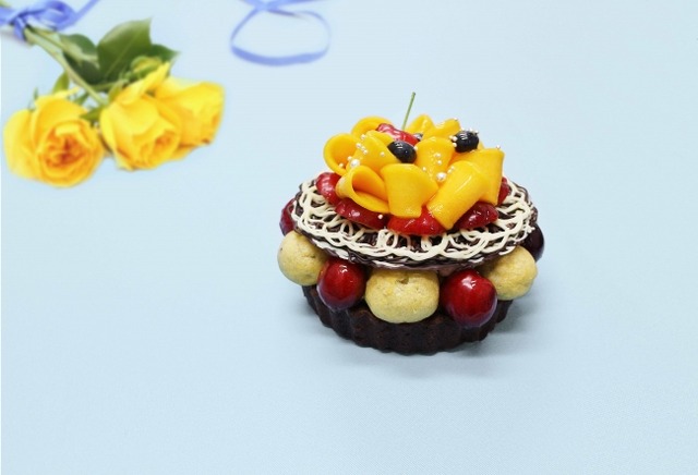 コクのあるマスカルポーネのベースに、甘酸っぱいアメリカンチェリーとまん丸のプチシューを交互に飾り付け、アクセントにマンゴーのリボンを飾り付けたポップなデザイン。