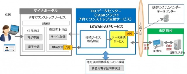 今回、提供を開始する「TASKクラウド子育てワンストップ支援サービス」は単に市区町村とマイナポータル上の子育てワンストップサービスを接続するだけでなく、当社独自のサービスとして、1.申請データをダウンロードする際に自動的に署名検証を行う機能、2.マイナポータルから定期的に申請データを取得・保管し、各種業務システムと自動連携する「データ連携サービス」――などを提供します。