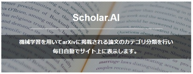 「Scholar.AI」は、人工知能の研究/開発に取り組む方向けに、人工知能関連の論文を毎日カテゴリ別に自動分類するサービスです。ユーザーはサイトにアクセスして自分の興味カテゴリをクリックするだけで、常に最新の論文を読むことができます。