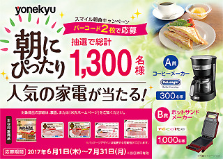 『米久 スマイル朝食キャンペーン』は、朝食にぴったりの、「御殿場高原あらびきポーク」をはじめとする米久のハム・ソーセージ・ベーコンが対象商品です。主婦に人気の家電「デロンギ コーヒーメーカー」が300名様、「レコルト ホットサンドメーカー」が1,000名様、総計1,300名様に抽選で当たります。