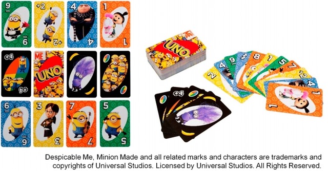このたび新たに発売となる「ウノ ミニオンズ」は、「ウノ ミニオンズ」だけのオリジナルカード「イーブルミニオン」が4枚入っております。このカードにはスペシャルルールである、「イーブルミニオン」カードが含まれており、このカードを出す人は好きな色を宣言でき、次の人に宣言した色のカードが出るまで引き札の山から引かせることができます。