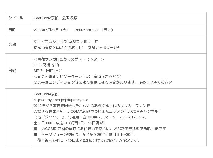 公開収録では、京都サンガF.C.で活躍中の高橋 祐治選手と田村 亮介選手をお迎えし、トークショーを行います。司会進行には、番組ナビゲーターでお笑いコンビ「きみどり」の土居 宗将さんが登場します。土居さんは、自身も星稜高校、早稲田大学で活躍した“吉本期待のサッカー芸人”として知られており、トークを通じて、チームの最新情報はもちろん、お二人の素顔やプライベートに迫ります。
