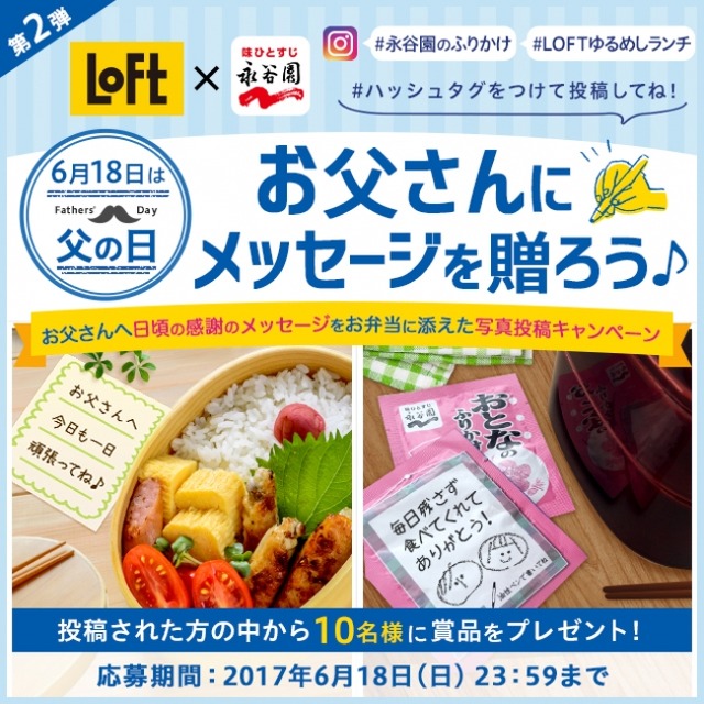 今回のコラボ記念として、父の日を前に日頃の感謝のメッセージをお弁当に添えた写真を投稿する写真投稿キャンペーンを実施します。永谷園公式インスタグラム・ロフト公式インスタグラムアカウントより募集告知し、父の日に向けて皆さんの想いのこもったお弁当写真を募集します。